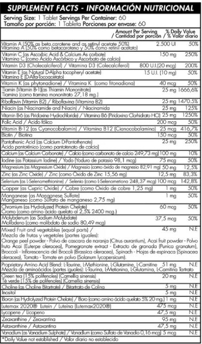 Cada frasco contiene 60 tabletas ofreciendo un suministro adecuado para un mes de bienestar integral. La fórmula de este suplemento se basa en ingredientes de alta calidad. Cada tableta está repleta de nutrientes esenciales incluyendo vitaminas como la A, C, D3, E y K, además de un completo complejo de vitaminas del grupo B como la B6, B12 y ácido fólico.